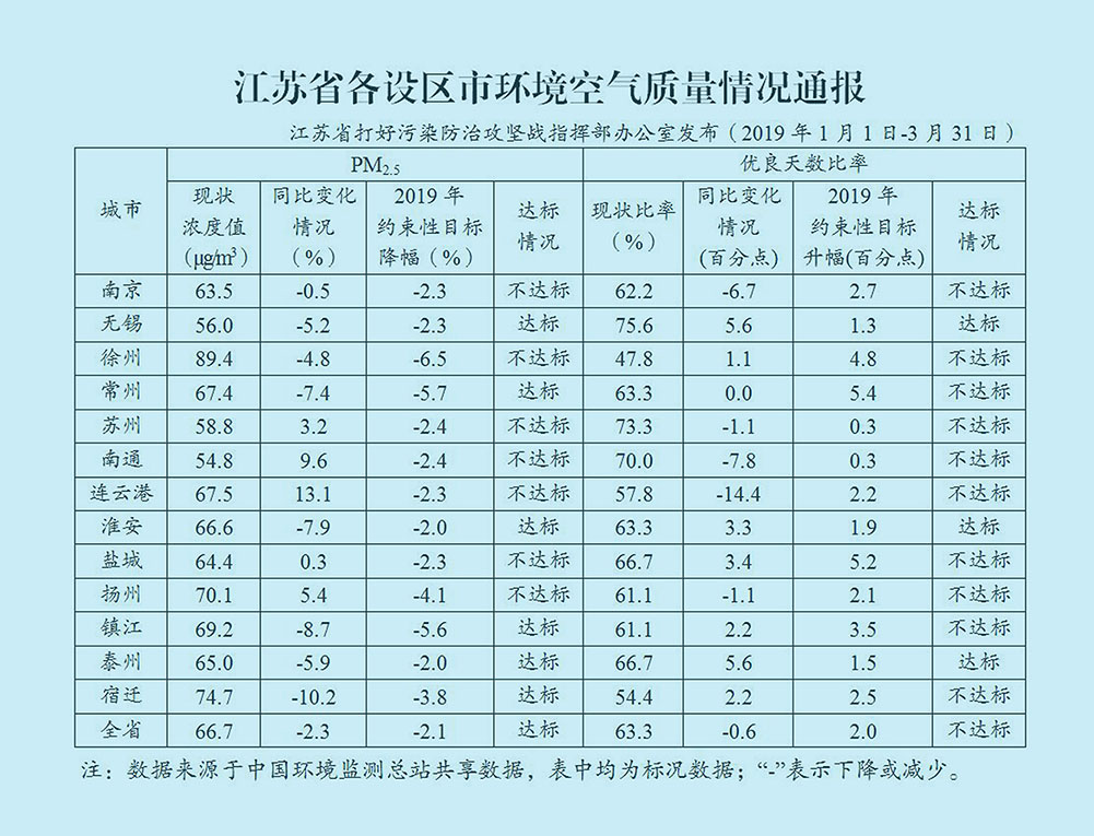通報(bào)顯示,2019年1月1日至3月31日,對照2019年各設(shè)區(qū)市環(huán)境空氣質(zhì)量改善約束性目標(biāo),13個(gè)設(shè)區(qū)市中,無錫、常州、淮安、鎮(zhèn)江、泰州和宿遷6市PM2.5濃度降幅達(dá)標(biāo),其他7市PM2.5濃度降幅未達(dá)標(biāo);無錫、淮安和泰州3市優(yōu)良天數(shù)比率升幅達(dá)標(biāo),其他10市優(yōu)良天數(shù)比率升幅未達(dá)標(biāo)。